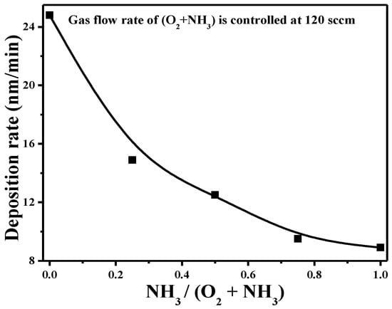 The optical emission spectra recorded from the glow discharge of the TMS-O2-NH3 gas mixture at an ammonia gas flow ratio of 0 (i.e., TMS-O2 gas mixture) and 0.5 are shown in Figure 1a,b, respectively. As shown in Figure 1a, the TMS monomer reacted with the oxygen gas, resulting in several additional emission lines other than the transition lines determined from the pure oxygen plasma shown in the inset figure. The emission lines at about 558, 777, and 844 nm were relevant to the transition lines of the oxygen atoms (O) or ions (O2+) [15,16]. The emission lines at about 450, 482, and 518 nm were related to the carbon-containing species of CO [16,17], whereas the emission peak at about 655 nm was assigned as the atomic emission of excited Hα [18,19]. In addition, the emission lines around the short wavelengths with two strong peaks at approximately 288 nm and 312 nm emerged from the species of the SiO and OH radicals, respectively [18,20,21,22]. In contrast, when ammonia gas was introduced into the gas mixture, the dominating emission lines over the OES spectrum (Figure 1b) were quite different from those of the glow discharge of the TMS-O2 gas mixture. As referred to in the inset OES spectrum of Figure 1b, measured from the pure ammonia plasma, the peaks at about 314, 335, 356, and 390 nm were attributed to the transition lines of the nitrogen molecules (N2) and the ions of the nitrogen molecules (N2+) [23,24]. The emission peaks at 426, 485, and 655 nm, in turn, corresponded to the molecular and atomic emissions of excited H2, Hβ, Hα [20,25]. Furthermore, a significant peak at about 387 nm emerged from the CN*/CH transition [24,26]. Based on the above-mentioned analyses, the oxygen-related plasma lines as well as the emission lines that emerged from the dissociation and oxidation between the oxygen and TMS monomer, such as SiO, CO, and OH species, were the main fingerprints determined from the OES spectrum recorded from the TMS-O2 glow discharge. In contrast, the hydrogen- and nitrogen-related emission lines that came from the dissociation of ammonia became the fingerprint of the OES spectrum observed from the glow discharge of the TMS-O2-NH3 gas mixture. It was also worth noting that the incorporation of the ammonia gas into the TMS-O2 gas mixture would limit the oxidation of the TMS monomer due to the inlet oxygen gas flow rate decreasing correspondingly, and the relative intensity of the oxidation-related emission lines thus decreased sharply. Figure 2 shows the deposition rate of the film as a function of the ammonia gas flow ratio in the glow discharge. As shown in Figure 2, the deposition of the SiOx film under the glow discharge of the TMS-O2 gas mixture corresponded to a high deposition rate of approximately 24.8 nm/min, while a sharp decrease in the deposition rate (~14.9 nm/min) was measured from the film synthesized from the ammonia gas incorporated into the reactive gas mixture at a gas flow ratio of 0.25. It implied that the deposition of the SiOx film was deeply relevant to the reduction in the oxidation-related radicals due to the decrease in the inlet oxygen gas flow rate rather than the increase in the nitrogen-related radicals. The deposition rate of the films under the TMS-O2-NH3 glow discharge was gradually decreased as the gas flow ratio of the oxygen gas in the reactive gas mixture decreased and the lowest deposition rate of about 8.9 nm/min was obtained from the film synthesized from the TMS-NH3 gas mixture.