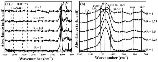 (a) Fourier transform infrared (FTIR) spectra of the films as a function of the ammonia gas flow ratio in the glow discharge and (b) a highlight of the spectra at wavenumbers ranging from 700 to 1300 cm-1.
