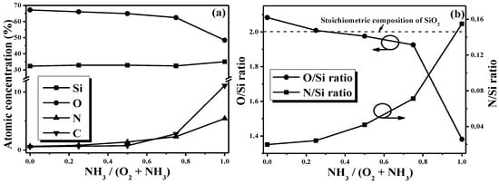 (a) Atomic concentrations and (b) the ratios of O/Si and N/Si for the films synthesized from various gas flow ratios measured by X-ray photoelectron (XPS).