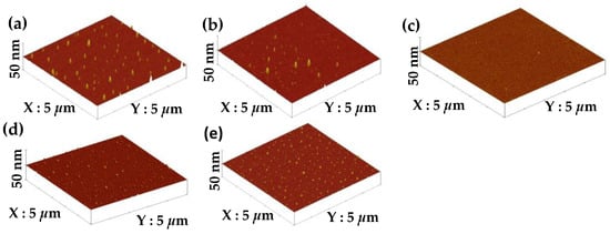 Surface roughness of the films synthesized from the gas flow ratios of (a) 0; (b) 0.25; (c) 0.5; (d) 0.75; and (e) 1, respectively.