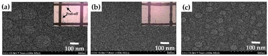 Surface morphologies of the films synthesized from the gas flow ratios of (a) 0; (b) 0.5; and (c) 1, respectively (the inset figures show the tape-peeling test result).