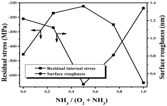 The relationship between the surface roughness and internal stress residing in the deposited film as a function of the gas flow ratio.
