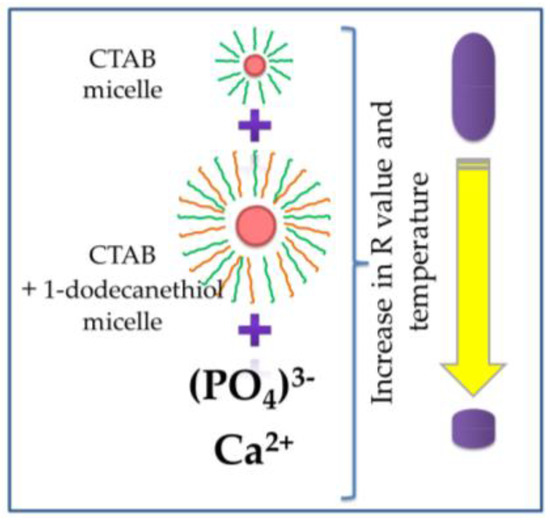 Scheme showing the morphological changes of hydroxyapatite (HAp) induced by the increase of temperature and the change of R ratios. CTAB for cetyltrimethylammonium bromide. Adapted from [11], Elsevier, 2016.