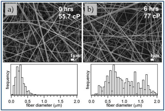 Representative SEM images and fiber diameter distributions of electrospun DMB fibers from a 7:3 mixture of 1,1,1,3,3,3-hexafluoroisopropanol/trifluoroacetic acid mixture processed immediately after dissolution (a) or after 6 h (b). Reproduced with permission from [66], American Chemical Society, 2014.