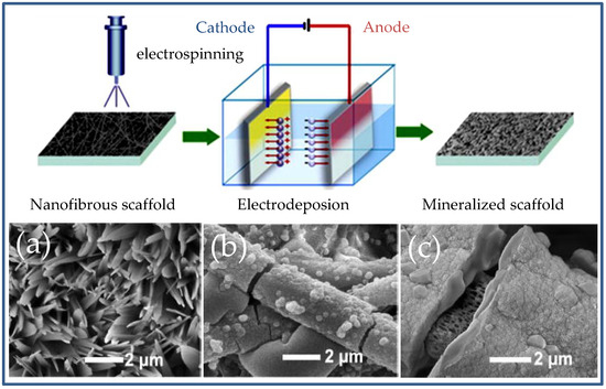 Scheme showing the fabrication of mineralized nanofibers by means of a final electrodeposition step (top). SEM micrographs of mineralized PLLA matrices are shown in the bottom: (a) electrodeposition at 3 V, 60 °C for 60 min; (b) mineralization in SBF for 12 days; and (c) mineralization in SBF for 30 days. Reproduced with permission from [68], Elsevier, 2013.