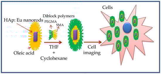 The resulting fluoride substituted HAp nanorods (FAp) have a hydrophobic surface, making difficult their dispersion in aqueous media and hindering biomedical applications [91,92]. Different surface modifications have been proposed to overcome this limitation and therefore commercially available amphiphilic polymers have been employed. These can establish hydrophobic interactions between the hydrophobic segments of polymers and the alkyl chain of coated HAp nanomaterials while keeping their polar groups in contact with the aqueous medium [93,94]. Diblock synthetic polymers derived from stearyl methacrylate (SMA) and poly(ethylene glycol) methacrylate (PEGMA) have been effectively employed as amphiphilic copolymers. FAp particles previously coated with oleic acid and doped with Eu3+ were able to interact with the diblock copolymer giving rise to stable particles in aqueous solution that kept fluorescent properties (Figure 6) [95].