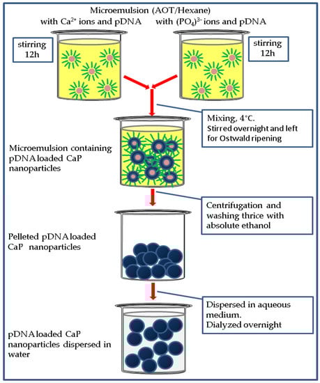 Flow chart showing the formation of nanoparticles encapsulating pDNA in the aqueous core of the bis (2-ethylhexyl) sulfosuccinate surfactant (AOT) microemulsion in hexane. The strategy involved the precipitation of the CaP in the aqueous core of the microemulsion droplets in the presence of pDNA. Adapted from [111], Elsevier, 2004.