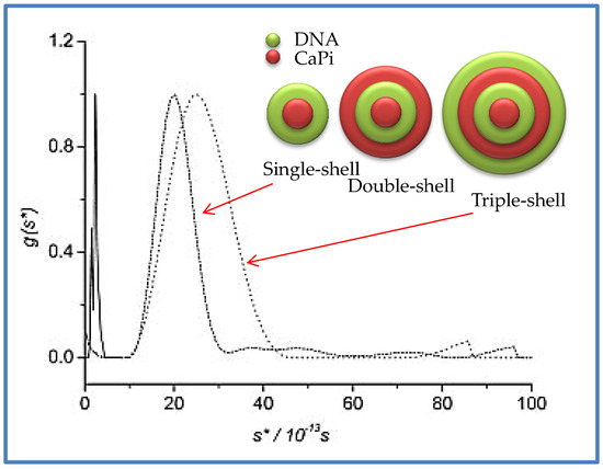 CaP/DNA nanoparticles with encapsulation of DNA by deposition of successive CaP layers, and their sedimentation coefficient distributions. Adapted from [121], John Wiley & Sons, Inc., 2006.