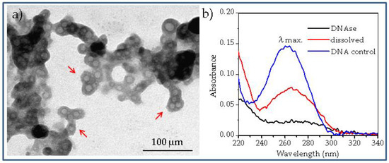 (a) TEM micrograph showing HAp-DNA nanocapsules. Red arrows point out capsules with a clearly distinctive contrast indicative of the encapsulated DNA in their inner part; (b) UV-vis absorption spectra of the aqueous solution/dispersion of HAp-DNA nanocrystals, sample digested with deoxyribonuclease to eliminate adsorbed DNA (black trace), corresponding samples after being dissolved in an acid medium (red trace), and DNA in aqueous solution (blue trace). Reproduced with permission from [126], Royal Society of Chemistry, 2013.