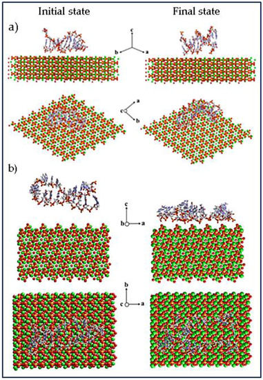 Theoretical calculations demonstrated that the exposed crystalline surface of HAp has a determinant influence on the adsorption capacity of DNA (Figure 12). Thus, the DNA secondary structure was well preserved on the (001) surface of HAp (Figure 12a) and even an attractive binding energy was determined. In contrast, repulsive interactions that led to DNA desorption were evaluated for the (010; OH−) surface. Finally, an attractive interaction that resulted in deformation of the double helix was observed for the (010; Ca2+) surface (Figure 12b) [127].