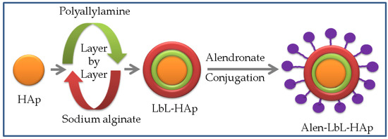 Alendronate (Alen) is a bisphosphonate with a recognized therapeutic effect against osteoporosis due to its ability to suppress bone resorption by inhibiting osteoclast activity [152]. Combination of the osteocoductive properties of HAp and the therapeutic effect of Alen was achieved by conjugating it into the outmost layer of a layer-by-layer (LbL) HAp coating based on poly(allylamine) and alginate (ALG) (Figure 13).