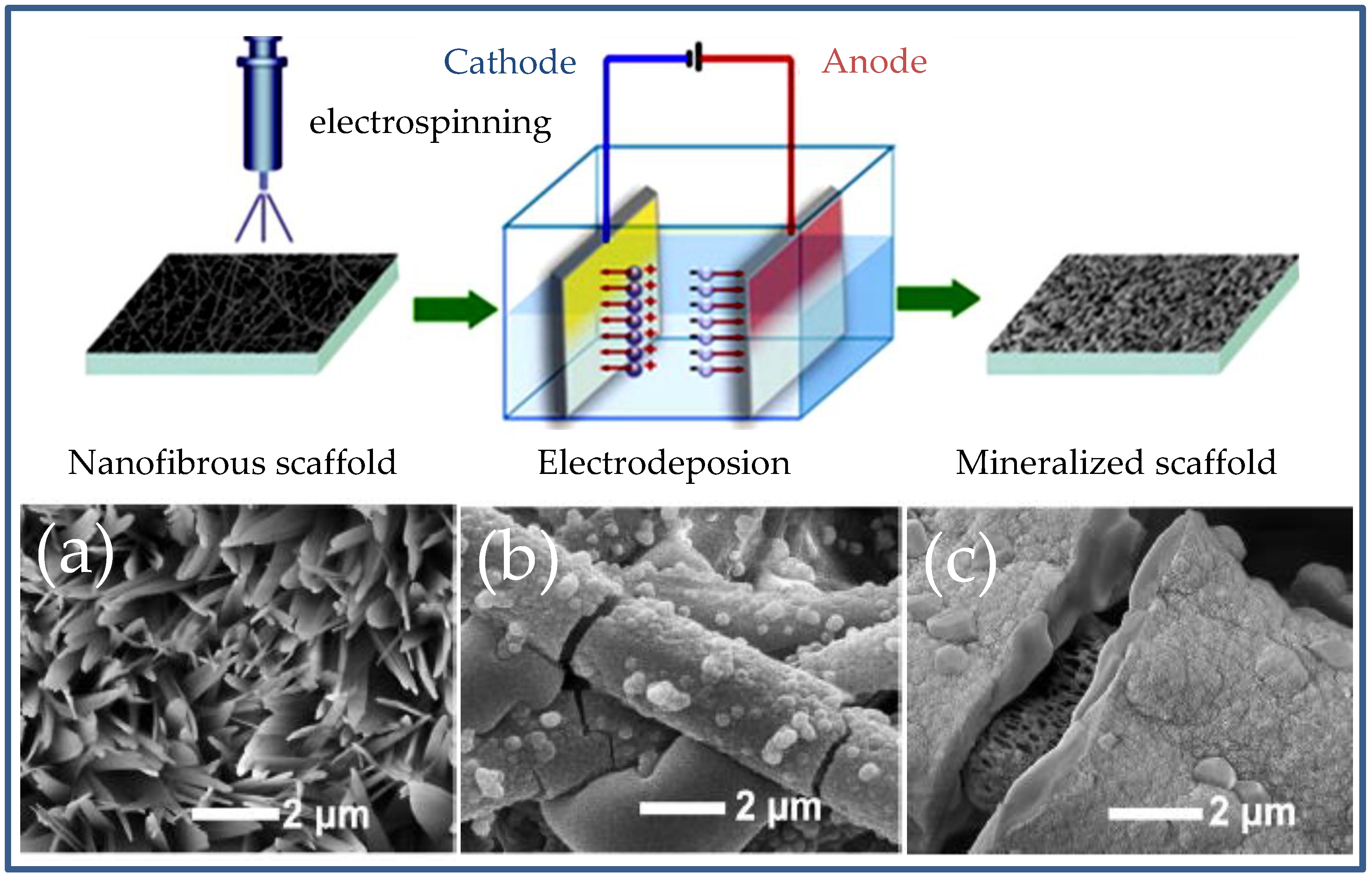 - He, C.; Jin, X.; Ma, P.X. Calcium phosphate deposition rate, structure and osteoconductivity on electrospun poly(l-lactic acid) matrix using electrodeposition or simulated body fluid incubation. Acta Biomater. 2014, 10, 419–427. [Google Scholar] [CrossRef] [PubMed]