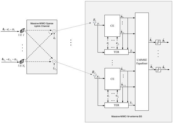 The rest of the paper is structured as follows. In Section 2, the system model under consideration for multiuser massive-MIMO uplink communications is presented. Section 3 presents first-order statistics of the received signals along with the proposed channel estimation techniques. In Section 3.1, an SiT least squares (SiT-LS) based channel estimation technique available in literature [26] is presented. Section 3.2 presents the proposed SiT-StOMP and SiT-GP channel estimation techniques for the case of sparse uplink channels in massive-MIMO. Section 4 discusses a minimum mean square error (MMSE) equalizer for a massive-MIMO uplink communication scenario. Section 5 presents the simulation results and a performance analysis for the proposed channel estimation techniques. In Section 6, conclusions are presented.