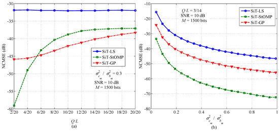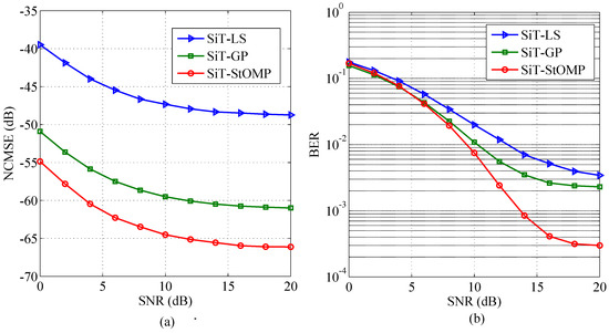 Performance comparison of the proposed SiT-StOMP and SiT-GP with that of the SiT-LS is presented in Figure 2 for NCMSE and BER against SNR, respectively. For this purpose, length of the information sequence is set as bits, sparsity level of the channel vectors as , and training-to-information ratio (TIR) as , respectively.