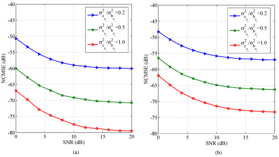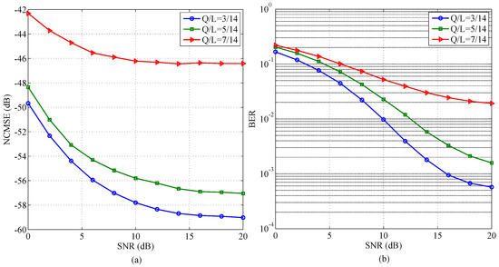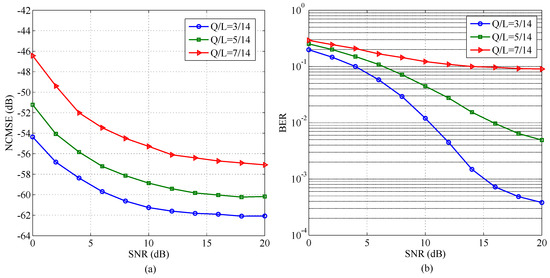 In order to demonstrate the performance of proposed schemes for different variants of channel’s sparsity parameter, i.e., , the NCMSE and BER are plotted in Figure 3 and Figure 4, respectively, for several values of (i.e., and ) by keeping the value of TIR equal to .