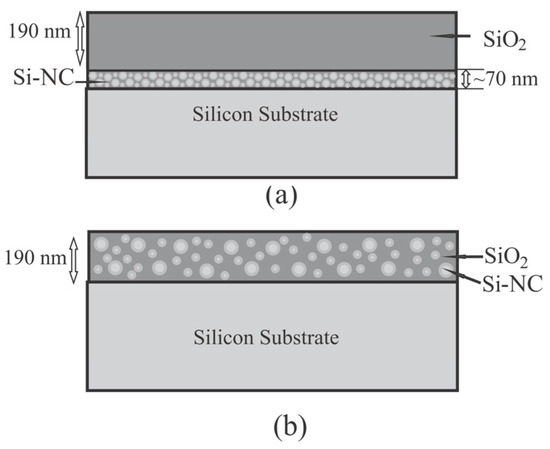 The embedded films were obtained by mixing the colloidal solution with the SOG solution with a volume ratio of 3:1 (Si-NCs:SOG). Then, the SOG with embedded Si-NC solution was spun onto the silicon substrates at 3000 rpm for 50 s. These films are schematized in Figure 1b.