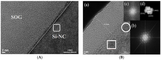 Cross-section TEM (transmission electron microscopy) images of coated films with red Si-NCs before (A) and after (B) thermal annealing at 1100 °C for 3 h in N2 atmosphere. In both images, the white square marks the area of analysis where there are Si-NCs. The insets of (B) are: (a) cross-section TEM images; (b) FFT (Fast Fourier Transform); (c) the specific pattern of the white square area; and (d) the electrons diffraction planes of the white square area. The white circle in the Figure 2B shows a zone where the SOG (Spin on Glass) flowed around the Si-NC after annealing.