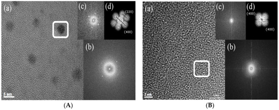 Cross-section TEM images of embedded films with red (A) and blue (B) Si-NCs, after thermal annealing at 1100 °C for 3 h in N2 atmosphere. In both images, the white square marks the area of analysis where there is a Si-NCs. The insets are: (a) the cross-section TEM images; (b) FFT; (c) the specific pattern of the white square area; and (d) the electrons’ diffraction planes of the white square areas, for each image.