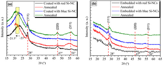 As observed in Figure 4a, a wide peak centered at ~23° can be seen in as-deposited samples, which shifts to a lower angle of 21.5° after thermal annealing for coated films with both red and blue Si-NCs. This shift has been associated with the formation of amorphous silicon oxide (a-SiO2) due to spinoidal decomposition [30]. Therefore, the structural units of the SOG, which can be described by the different tetrahedral units SiO4-xSix with n = 0−4, gradually transform into well-defined SiO4 and Si-Si4 tetrahedral structures [23,24]. This transformation, only observed in the coated films, agrees with the TEM observation of the SOG flowing into the Si-NCs layer after thermal annealing.