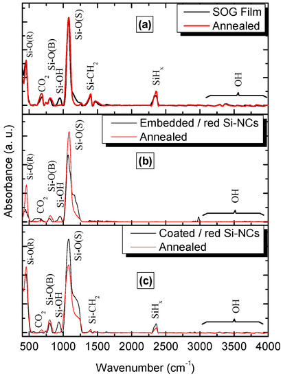 The typical IR (infrared) vibration modes from silicon oxide films [31,32] at 1078 cm−1 ( Si-O-Si stretching), 800 cm−1 (O-Si-O bending), and 457 cm−1 (Si-O-Si rocking) can be observed in all of the cases. All the absorption spectra show a peak at 1400 cm−1 due to the Si-CH2 stretching bonds, as well as some other peaks related to vibration modes associated with hydrogen bonds at 935 cm−1 (Si-OH stretching) and >3200 (H2O) cm−1. The latter decreases in intensity or disappears after the thermal annealing [31,32]. It is noticeable that both before and after annealing, the IR spectra of the pure SOG film are similar to the IR spectra obtained from the coated and embedded films with Si-NCs (Figure 5b,c).