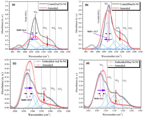 The stretching infrared (IR) peak observed in coated samples with red and blue Si-NCs shifts towards a lower wavenumber after thermal annealing, as observed in Figure 6a,b, respectively. However, this IR band shifts towards the opposite direction for the embedded red and blue Si-NCs films, as observed in Figure 6c,d, respectively. A deconvolution of the IR stretching peak (symmetric and asymmetric) in the LO and TO modes shows a change in the full width at a half maximum (FWHM) associated with the formation of amorphous phases of SiO2 (peak at ~1025 cm−1) in the Si-NCs/SOG interface after thermal annealing. This is an indication of a possible combination of non-stoichiometric and stoichiometric SiO2 [7,36]. The Si-NCs could react with the oxygen atoms of the SOG due to the silicon atoms presenting a higher probability of having oxygen neighboring atoms, forming Si=O related bonds [14]. This is confirmed by the shift of about 16.4 cm−1 and 13.7 cm−1 to lower wavenumbers of the stretching Si-O-Si peak for each coated film, as observed in Figure 6a,b. In addition, the observed broadening of the IR stretching peak could be related to a strain between the Si-NCs and the SiO2-based SOG film, producing the formation of a high defect density after the thermal annealing in N2 atmosphere [37].