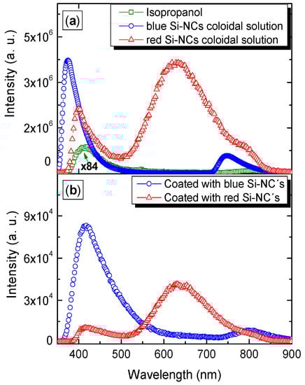 Si-NCs obtained through porous silicon samples exhibit a typical strong red PL emission with a quasi-Gaussian curve [31], which is usually attributed to the quantum confinement effect [1,6]. The PL spectra obtained from the Si-NCs-based colloidal solutions for this work are shown in Figure 7a. The PL spectrum of the red Si-NC colloidal solution has a main peak at around 639 nm (which is similar to that of pSi layers; not shown), and a lower intensity secondary PL peak at 400 nm. As observed in Figure 7a, the PL spectrum of the isopropanol solution without Si-NCs also exhibits peaks at about 415 nm, but its intensity is very low as compared to the PL from samples with them.