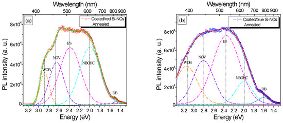 Figure 7b shows the PL spectra of the coated red and blue Si-NC films before thermal annealing. Coated red Si-NCs show a broad PL band with a maximum peak at ~650 nm and a less intense band at ~415 nm, while the coated blue Si-NC films emit an intense PL band with the main peak at ~410 nm and a very small secondary peak at ~800 nm.