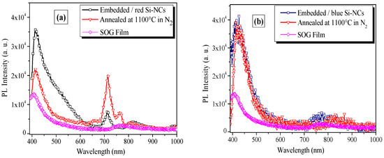 The PL spectrum obtained from the embedded films with red Si-NCs presents a peak at ~715 nm, and a more intense one at ~410 nm, which is related to the SOG PL emission, as observed in Figure 9a. The embedded films with blue Si-NCs exhibit a maximum PL peak at ~430 nm, and a less intense one at ~850 nm, as shown in Figure 9b. The PL emission observed in embedded films with both red and blue Si-NCs before thermal annealing is similar to that observed in the colloidal solutions (Figure 7a). Since the SOG around the Si-NCs is not chemically bonded to them, the embedded film emission is ascribed to the quantum confinement mechanism, as proposed by other authors for similar films [25,50].