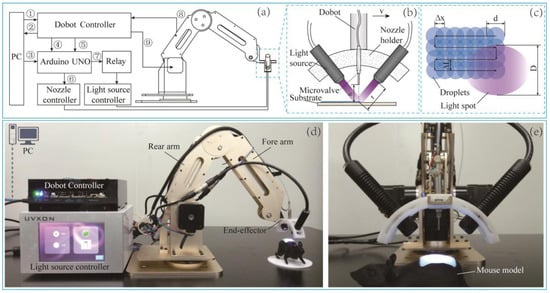 In Figure 1a, the computer is connected to the Dobot controller (Shenzhen Yuejiang Technology Co., Ltd., Shenzhen, China) and Arduino singlechip via the USB interface. Arduino singlechip is connected to the light source controller (Shenzhen Youxi Technology Co., Ltd., Shenzhen, China) and nozzle controller (Lee Company, Westbrook, CT, USA). The relay is used to connect the Arduino singlechip and the light source controller.