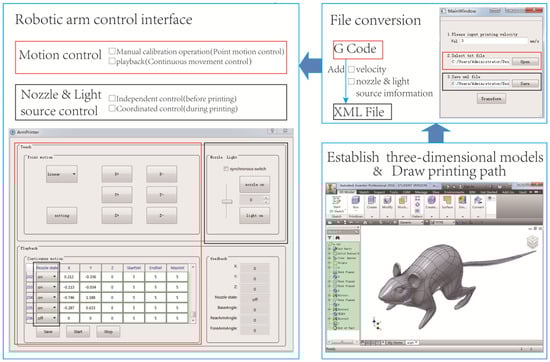 Software is cooperating with the hardware during the entire printing process. The operation interface (as shown in Figure 2) and functions of the robotic arm printing platform are written with Qt Creator 5.5.1 (Qt Company, Espoo, Finland). These functions include motion control (i.e., manual calibration operation and playback operation) as well as nozzle and light source control (i.e., independent control and coordinated control). The communication between computer and the robotic arm is through the serial port. The communication protocol adopts a fixed frame format with 42 bytes per frame.