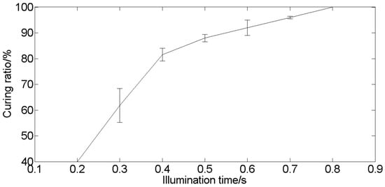 The relationship between curing ratio and illumination time. The data points were linked together by straight line. Error bars represent the standard deviation. Three samples were taken for each illumination time.