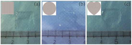 Initial printing trials were performed to print 2D structures using the parameters listed in Table 2. In order to form a smooth line, both droplet spacing (Δx) and line spacing (ΔL) were set as 0.75 mm so that about half of the two droplets could overlap together. The nozzle velocity (v) and nozzle frequency (F) were calculated according to Equations (1) and (2). Three different plane shapes were printed using PEGDA hydrogel (as shown in Figure 5). In visual observation, the formed hydrogel structures were transparent with adequate water content. The outer contour was intact with a smooth appearance. The thickness of formed hydrogel was 466 ± 6 μm (square), 471 ± 5 μm (circular) and 470 ± 7 μm (heart-shaped). The thickness was independent of the geometrical shapes.