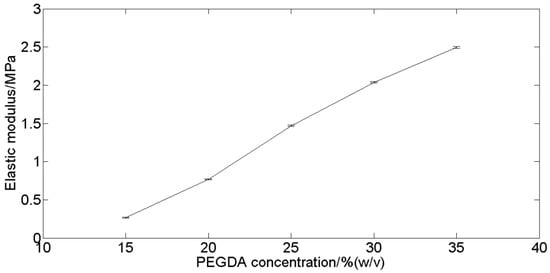 The obtained elastic modulus had a linear proportion to the PEGDA concentration (as shown in Figure 6). The elastic modulus of 15% PEGDA was 0.266 ± 0.006 MPa. In contrast, the elastic modulus of 35% PEGDA was 2.495 ± 0.011 MPa. The elastic modulus of the 20% PEGDA we used was 0.770 ± 0.006 MPa.