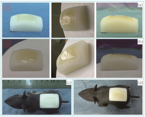 (a) The defect was filled by ring path in-situ printing; (b) the defect was filled by parallel path in-situ printing; (c) mouse model with unfilled defect; (d) mouse model with filled defect.