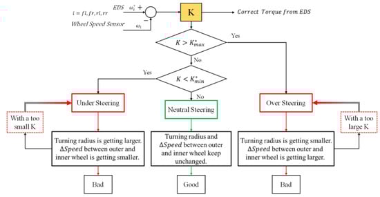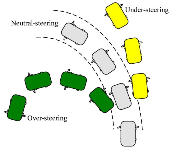 Most automotive differentials use limited slip differential (LSD) to turn a car. Under normal circumstances, LSD can follow the normal steering curvature at high speeds. However, if the vehicle is driven at low speeds, it will deviate from the original trajectory due to the reduction in traction. Cornering is a problem in LSD that can lead to vehicles not traveling in one direction and it, as shown in Figure 1, can be categorized into three types: under-steering, neutral-steering, and over-steering. Under everyday skidding scenarios, these driving styles are adjustable by the electronic differential system (EDS) [1,2,3,4,5,6,7]. The EDS aims to distribute the torque command to the left and right wheels for the required vehicle motion and orientation control. These two input commands are initiated so that we can easily pilot the vehicle for moving forward and orientation control via the steering wheel and pedal (i.e., two decoupling commands). Hence, different EDS settings represent different driving styles. For example, in the under-steering EDS setting, the vehicle continues to travel in one direction despite sharply turning the steering wheel. Conversely, in over-steering EDS, the vehicle rotates more than requested by the driver, causing the rear of the vehicle to swerve outwards. Different EDS settings respond to different steering experiences and energy consumptions differently. In order for vehicles to travel in the original trajectory at any speed and not slip, we plan to employ a new EDS to improve the disadvantages of LSD.