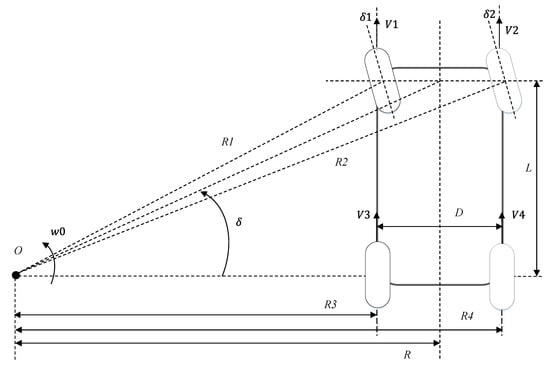 EDS was created to solve the turning issue for four-wheel drive electric vehicles. Many successful studies have since been proposed [12,13,14,15,16]. Figure 2 shows a basic scenario of a turning vehicle. It shows the kinematic model of the proposed system in a left turning maneuver, where δ is the turning angle command, and are the turning angle of the front left and right wheels, is the wheelbase, is the rear gauge, is the rotational speed of turning, is the radius of turning, is vehicle speed, , are the tangential speed of the front and rear left wheels, and , are the tangential speed of the front and rear right wheels. Generally, the speed of both the front and rear wheels should be the same in order to keep the vehicle traveling in a straight track. However, if the vehicle makes a turn, the speed differential must be constructed by a mechanism that entails less wire slipping and scrapping. Clearly, for a left turn scenario, if is the preferred rotating command, then and