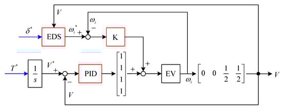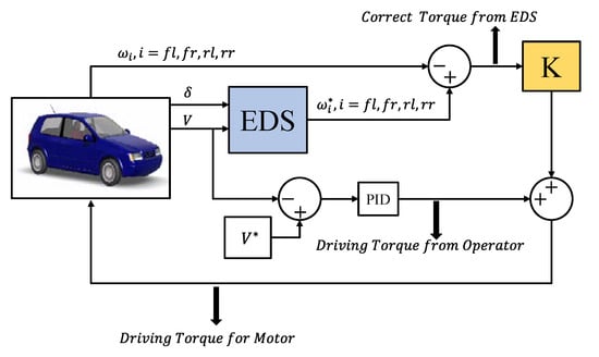 The aforementioned studies solve the EDS for speed control in a four-wheel drive vehicle. However, usually the vehicle is operated by users under a pedal command (acceleration command) for torque distribution. Consequently, the aforementioned approaches are not so straightforward. Figure 3 shows the scheme of the proposed EDS. Figure 4 illustrates its corresponding control block diagram. Clearly, the actual vehicle speed is set as follows considering cost-effectiveness: