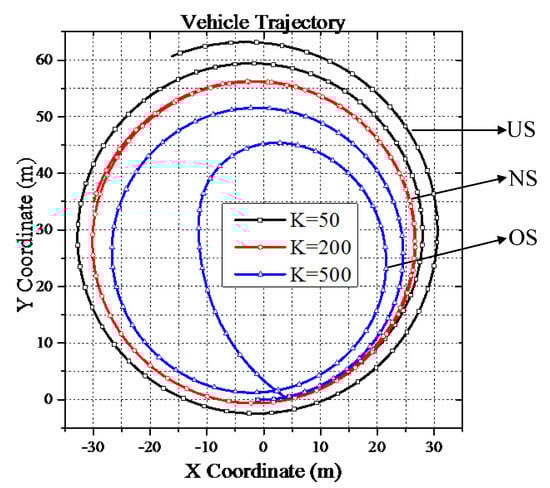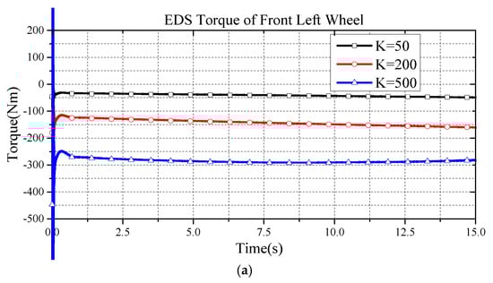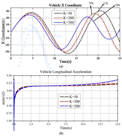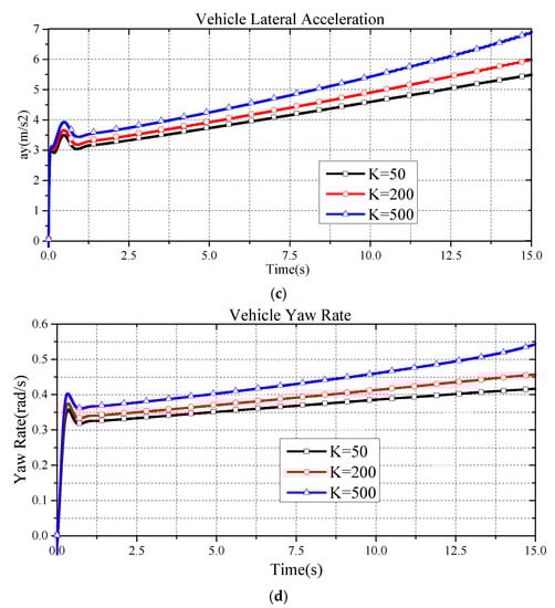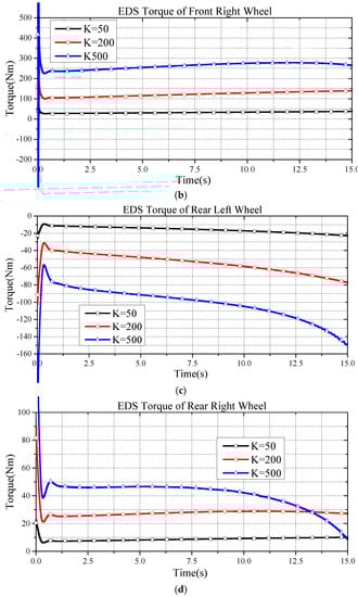 In this section, the simulation results of the proposed approach are given. Figure 7 shows the evaluation of the proposed EDS in Figure 3 with a different K gain. Note that US stands for under-steering, OS represents over-steering, and NS is neutral-steering. Evidently, under K = 200, the system can achieve neutral-steering, which ensures safe operation. Figure 8 shows all of the performance indexes which concern the evaluation of Figure 7. Figure 8a shows that OS is nimbler and US is more sluggish. OS is suitable for a racecar, and NS is fit for everyday drivers. Figure 8b–d are the longitudinal acceleration, lateral acceleration, and yaw rate of the test, respectively. To sum up, OS is nimble, NS is normal, and US is sluggish. Figure 9 shows the adjusted torque from EDS in these three scenarios. Note that, in the case of K = 500, the vehicle falls into a state of continuous OS. At 10 s, the vehicle becomes unstable as the torque of the rear left wheel increases and the torque of rear right wheel decreases.