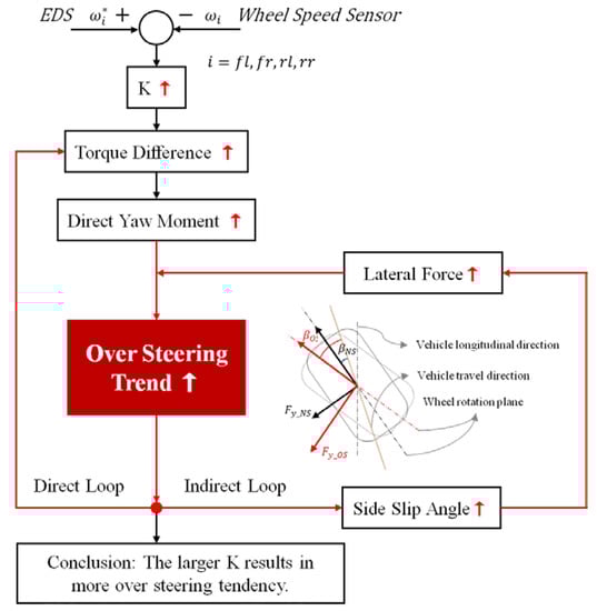 This paper has established an EDS control strategy for four-wheel drive electric vehicles. Numerous steady steering simulation tests that comply with the requirements of ISO4238:2012 were carried out to study the characteristics of EDS. The simulation results demonstrated that given a larger feedback gain, the actual wheel speed can better track the reference wheel speed from the EDS. However, in this case, the vehicle shows an obvious over-steering tendency. On the contrary, the wheel speed cannot track the reference wheel speed well with a small feedback gain. In order to find the mechanism of the specific phenomenon above, this paper made a deep discussion and analysis from the aspects of vehicle dynamics and nonlinear tire property. As a conclusion, for the vehicle system with EDS control, there should be an adjustable feedback gain, rather than a fixed one, to deliver good steering characteristics. This feedback mechanism will contribute to the future research and development on EDS, especially to improvement in the vehicle steering characteristics.
