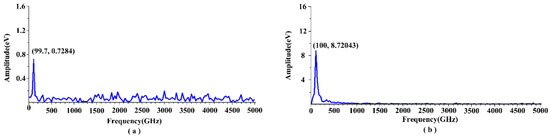 where F is the electrostatic force between two plate electrodes; W, d0 are the energy and distance between the two plate electrodes, respectively; U is the voltage loaded between the two plate electrodes; and a, b are the length of the plate electrodes. Different voltages are selected to obtain different magnitudes of stress. A uniform force is loaded perpendicularly on the surface of the graphene, except the fixed ends (Figure 5). The electrostatic force is evenly distributed on each atom in the graphene nanosheet [29]. The total force is F = f × N, where f is the force applied to each atom of the graphene sheet, and N is the number of atoms in graphene’s effective region. The applied indented forces were 1.77 nN, 7.07 nN, 15.92 nN, 28.29 nN, 44.20 nN, 63.65 nN, 86.64 nN, and 113.15 nN. In this communication, a Fourier transform was applied to obtain the resonant frequency of the graphene with two different vacancies by selecting the kinetic energy of the system as the time-domain signal [30]. When the graphene is subjected to a certain load, the potential energy of the system will change accordingly. After 20,000 time steps, the load applied to the graphene was removed. The graphene structure will recover to the initial state due to the C-C bonds inside the graphene structure. At this point, the potential energy of the graphene will be converted to kinetic energy, and the graphene structure will oscillate. When the kinetic energy and potential energy of graphene were converted to each other, the graphene structure undergoes free vibration. During oscillation, 250,000 time steps or 250 ps were carried out. Figure 6 shows the amplitude versus frequency curve of the graphene sheet with a single defect. Figure 7 shows the function of resonance frequency of external force with two different vacancy defects.