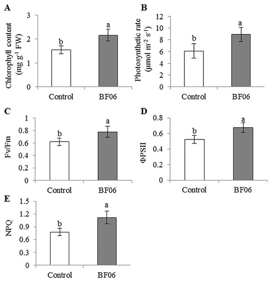 The release of VOCs by BF06 increased chlorophyll content and photosynthetic efficiency in Arabidopsis. After 10 days of exposure to microbial VOCs, we examined chlorophyll content (A); and photosynthetic parameters including photosynthetic rate (B); Fv/Fm (C); ΦPSII (D); and NPQ (E) in plants. Different letters represent a significant difference between the control and VOCs-exposed plants at p < 0.05.