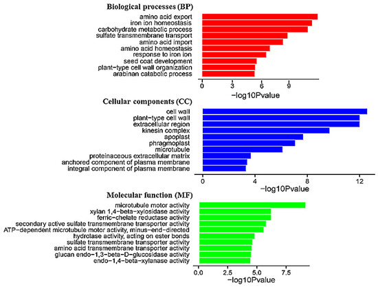 To decipher the mechanisms underlying the release of VOCs by BF06 regulated plant growth, whole genome expression profiling of Arabidopsis plants was performed using RNA-Seq. For this purpose, seven-day-old Arabidopsis plants were grown on 1/2 MS medium for 10 days with or without exposure to BF06 VOCs. Changes in gene transcription were examined by comparing the control and VOCs-exposed plants. To evaluate the accuracy of RNA-Seq analyses, the original sequences were firstly filtered to ensure the quality of reads. The RNA-Seq generated about 35.5 million raw reads, and approximately 98% of the raw reads were mapped to the Arabidopsis genome. The RNA-Seq analyses further revealed that 761 genes were differentially expressed in the VOCs-exposed plants. Compared with the controls, 335 genes were upregulated and 426 genes were downregulated in the VOCs-exposed plants (Table S3). To further explore the biological processes in Arabidopsis plants that were mediated by VOCs released by BF06, gene ontology (GO) analysis was applied to the above DEGs, and enrichment analysis was carried out by using an FDR-adjusted p value < 0.05 as the cutoff. The GO enrichment analysis revealed the major functional categories including biological processes (BP), cellular components (CC), and molecular function (MF) in the upregulated (Ur) and downregulated (Dr) DEGs. The most overrepresented GO terms in the BP domain of Ur DEGs related to some important metabolic pathways such as amino acid transport, Fe homeostasis, response to Fe, and sulfate transport (Figure 3). Furthermore, the most overrepresented categories in the BP domain of Dr DEGs were closely associated with the abscisic acid (ABA)-related pathways including response to ABA, response to various stresses such as water deprivation, cold, salt and wounding, and glutathione, hydrogen peroxide, and toxin catabolic processes (Figure S1).