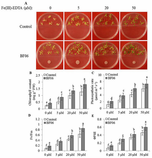 BF06 VOCs promoted the growth of Arabidopsis plants under Fe-limited conditions. Seven-day-old seedlings were cultured on an alkaline MS medium containing different Fe levels (0, 5, 20, or 50 μM Fe(III)-EDTA) for 10 days with or without exposure to BF06 VOCs. The control and VOCs-exposed plants were used to analyze plant growth phenotype (A); chlorophyll content (B); photosynthetic rate (C); Fv/Fm (D); and ΦPSII (E). Different letters represent the significant difference between the control and VOCs-exposed plants at p < 0.05.