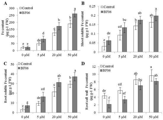 When plants were grown on the medium without the Fe source, BF06 VOCs exposure obviously ameliorated plant Fe deficiency. However, no significant difference in total Fe content was observed between the control and VOCs-exposed plants (Figure 5A). To account for this, the soluble and cell wall Fe was analyzed in the control and VOCs-exposed plants. The soluble Fe content of shoots or roots in the controls was markedly lower than in the VOCs-exposed plants (Figure 5B,C). It has previously been indicated that the cell wall plays an important role in Fe stores in plants under Fe-deficient conditions [45]. Thus, we assessed whether BF06 VOCs exposure promoted the release of root cell wall Fe under Fe-limited conditions. In this study, the cell wall of control roots had less bound Fe than the VOCs-exposed roots (Figure 5D). Similar phenomena were observed where VOCs exposure remarkably increased the soluble Fe in plants under different Fe conditions (Figure 5B,C). Our results implied that the VOCs-induced increase of soluble Fe contributed to enhancing the availability of cell wall Fe.
