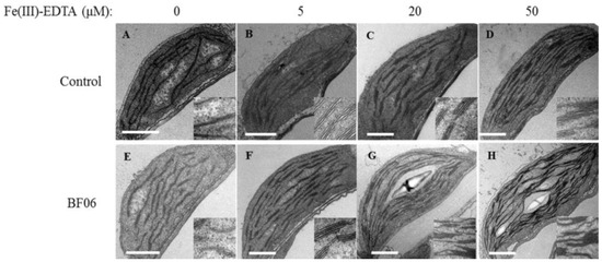 Furthermore, ultrastructural observation of mesophyll cells revealed that few grana lamellae rudimentary grana occurred in the chloroplasts of control plants, displaying the classic traits of thylakoid disorganization caused by Fe deficiency (Figure 6A–D). By contrast, when plants grown under alkaline stress were exposed to BF06 VOCs, the number of normal grana stacking and grana lamellae was markedly increased (Figure 6E,H). For example, no starch granules and less grana stacking was observed in the chloroplasts of control plants grown at 20 or 50 μM Fe(III)-EDTA, whereas the chloroplasts of VOCs-exposed plants exhibited better development with more grana stacking and starch granules.