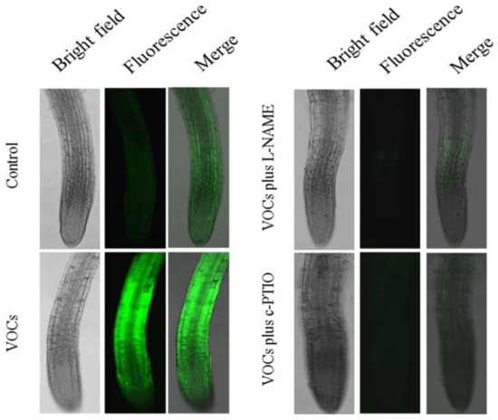 NO functions as a reciprocal signaling molecule in plant–microbe interactions, involving modulation of various physiological processes such as bacterial biofilm, plant growth, and development [55,56,57]. NO has been demonstrated to play an essential role in controlling Fe absorption in plants under Fe-limited conditions [58,59,60]. Here, DAF–FM DA was first used to analyze the accumulation of VOCs-induced NO in Arabidopsis roots. As shown in Figure 7, only a slight NO-associated fluorescence was detected in the roots of control plants grown on an alkaline MS medium containing 50 μM Fe(III)-EDTA, whereas the VOCs-exposed roots exhibited stronger fluorescence than the controls. Moreover, the VOCs-induced accumulation of root NO significantly decreased after treatment with the nitric oxide synthase (NOS) inhibitors, Nω-nitro-l-arginine methyleste (L-NAME, 5 mM), or the NO scavenger, 2-(4-carboxyphenyl)-4,4,5,5-tetramethylimidazoline-1-oxyl-3-oxide (c-PTIO,1 mM).