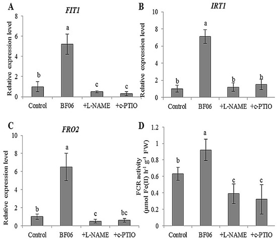 NO has been demonstrated to be involved in the regulation of plant responses and tolerance to Fe-deficient conditions [59]. Moreover, NO exposure can promote the formation of nitrosyl–Fe complexes, thereby increasing the mobilization of Fe and delivery of NO to different tissues [61]. Reduced production of NO influences FIT-regulated Fe deficiency responses in plants. The Arabidopsis FIT1 plays a vital role in mediating Fe deficiency responses, which is responsible for upregulating IRT1 and FRO2 [35]. In this study, BF06 VOCs exposure significantly enhanced the expression of FIT1, IRT1 and FRO2 in plants under alkaline stress. As shown in Figure 8A–C, after 10 days of exposure to BF06 VOCs, the expression of FIT1 increased at least 6-fold in plants grown on an alkaline medium containing different Fe concentrations. The transcription of IRT1 and FRO2 was elevated more than 6-fold in the VOCs-exposed plants compared with the controls. Moreover, the activity of FCR in the VOCs-exposed plants was markedly higher than in the controls. However, the activity of FCR was significantly decreased in plants treated with L-NAME or c-PTIO. Similarly, the transcription levels of FIT1, FRO2, and IRT1 were also markedly lower in the non-treated plants than in the L-NAME- and c-PTIO-treated plants.