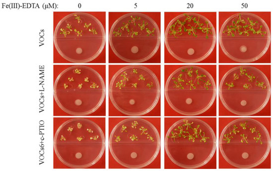 Phenotype of the BF06 VOCs-exposed Arabidopsis plants after treatment with L-NAME or c-PTIO. Arabidopsis plants were grown on an alkaline MS medium (pH = 7.6) for seven days, then transferred to 1/2 MS medium containing different Fe levels (0, 5, 20, or 50 μM Fe(III)-EDTA) with exposure to BF06 VOCs for 10 days. However, treatment with L-NAME or c-PTIO diminished the positive effects of BF06 VOCs on alleviating plant Fe deficiency.