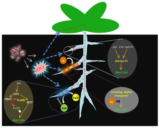 In the past decade, Fe deficiency in plants has become one of the most crucial issues for human health. Over 50% of the world’s population is anemic, primarily due to Fe deficiency [36]. Therefore, understating mVOCs-induced plant uptake of Fe is beneficial to increase the source of Fe in foods for humans. Besides Fe, improved selenium (Se) absorption by plants has recently attracted considerable attention. Although Se is not essential for plant growth, it can enhance the tolerance of plants to various abiotic stresses by activation of antioxidant defense systems [37]. For both animals and humans, Se is an essential mineral element require for growth, immune functions, and metabolism [38]. Se in soil can be directly taken up by plants and enter into the food chain. The Se content of plant foods is closely related to soil Se levels, and a low availability of Se in soils has been reported in many countries such as China, Korea, Japan, the USA, and Australia [39]. Thus, it is imperative to develop efficient strategies to improve plant Se absorption. It has increasingly been recognized that several Bacillus strains such as B. cereus YAP6, B. licheniformis YAP7, and B. pichinotyi YAM2 exhibit great potential to increase Se uptake in wheat plants [40,41]. Nevertheless, whether mVOCs affect plant Se assimilation and its underlying mechanisms has not been determined to date.