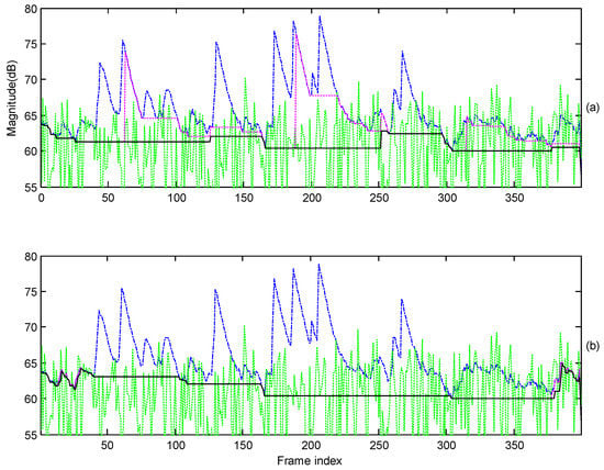 Contour of estimated minimum power. (a) Minimum power estimated by the MCRA noise estimator for a sub-band (solid: minimum power, green dotted: true noise power, blue dotted: temporary power, dash dot: local power), spoken by a female speaker, interfered by white noise with an average SegSNR = 10 dB); (b) Minimum power estimated by the proposed noise estimator.